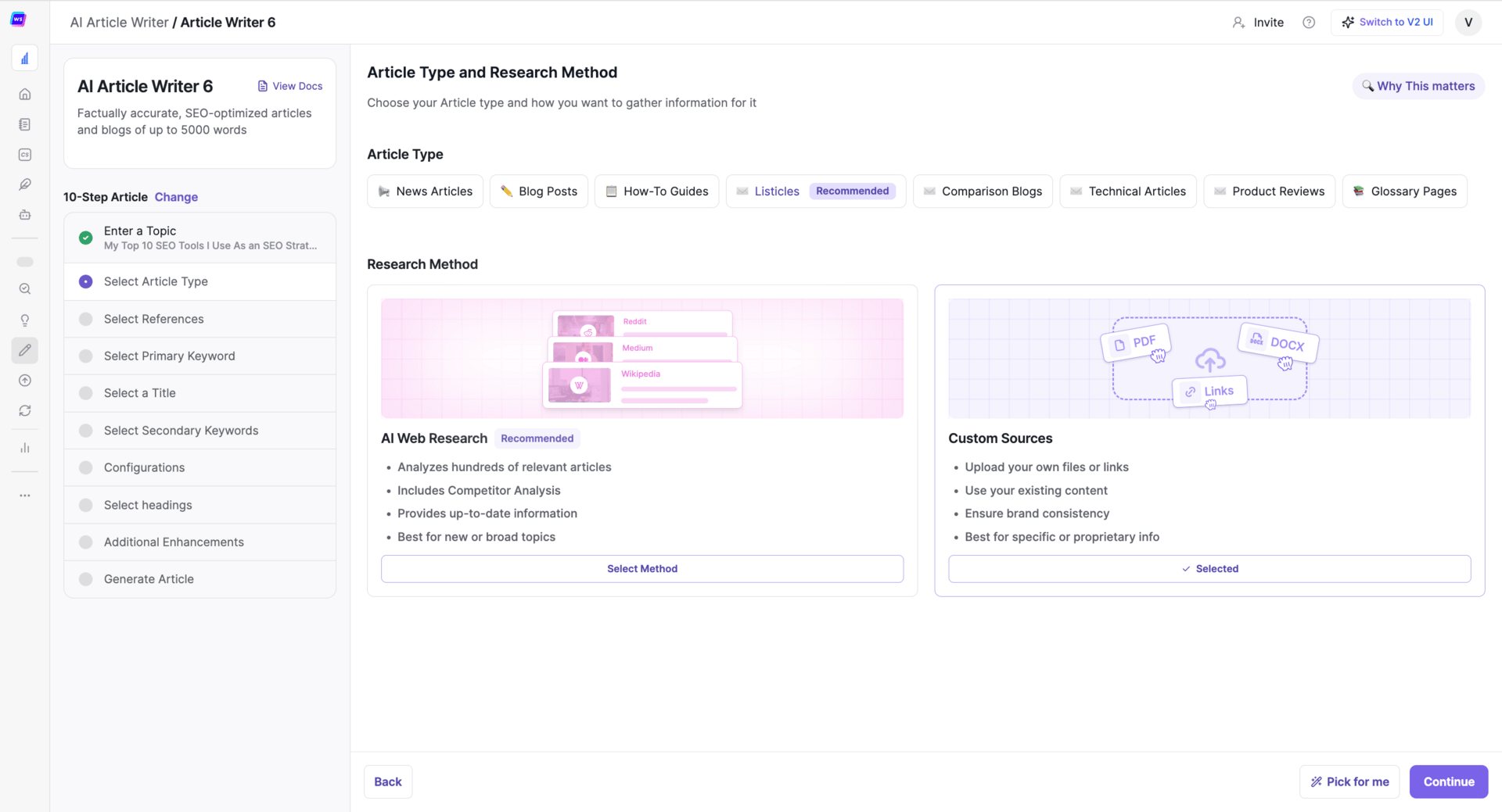 The content creation process includes 10 steps. It starts with choosing the type of article you want (I chose a listicle) and the research method for gathering sources.