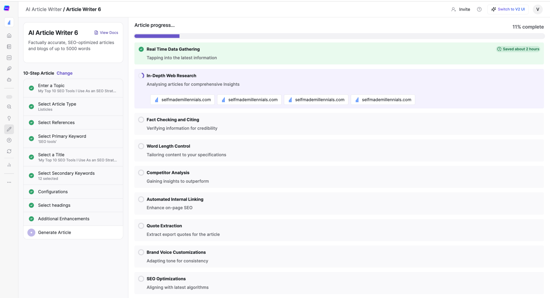 Once you’ve filled in all your requirements (which does take time if you want decent content), the AI starts generating content while doing the following: