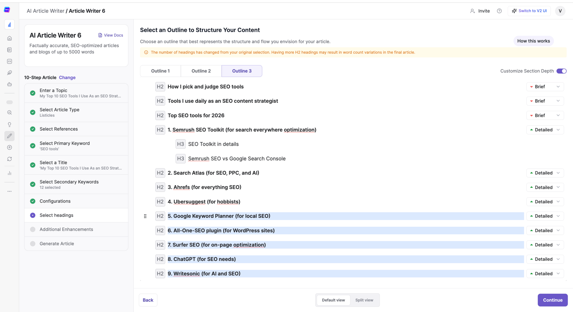 The whole workflow is thoughtfully designed. If you don’t like the suggested outline, you can fully customize it, even down to setting the depth of each paragraph.